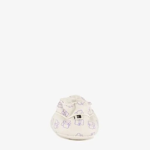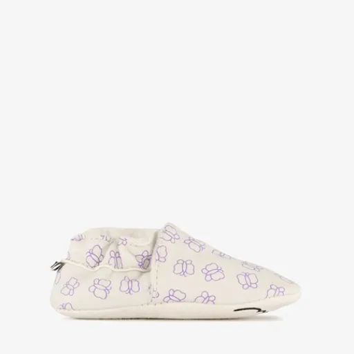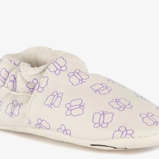Lichtgrijze babyschoenen met opdrukken van vlinders. Gemaakt van leer met een flexibele, soepel buitenzool. Deze schattige babyschoentjes hebben een heerlijke zachte voering en zijn voorzien van elastische inzetten bij de instap. Hierdoor trek jij de schoenen makkelijk aan bij je kind. Het comfortabel voetbed van textiel is niet uitneembaar.