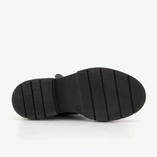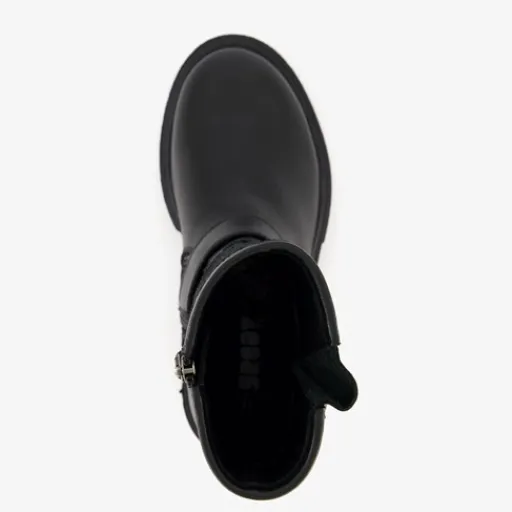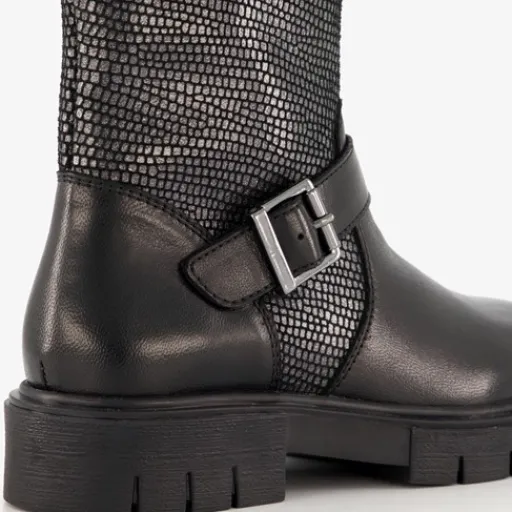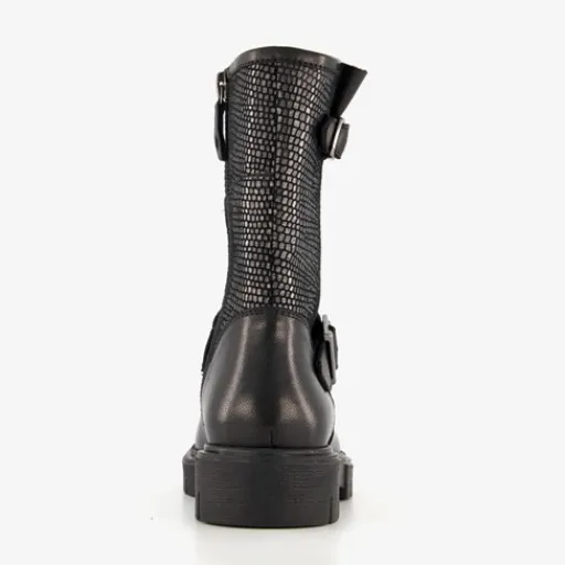Zwarte biker boots voor meisjes van Groot. Gemaakt van leer, een binnenwerk van textiel en een rubberen zool. De boots hebben een ritssluiting aan de binnenzijde en twee gespen. Het vaste voetbed is gemaakt van leer. De stoere biker boots hebben een metallic dessin op het bovenwerk en een schachthoogte 18 cm.