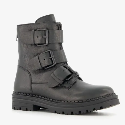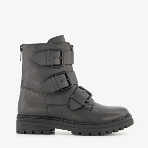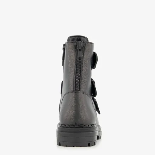Zwarte biker boots voor meisjes van Groot. Gemaakt van leer, een binnenwerk van textiel en een rubberen zool. De boots hebben een ritssluiting aan de binnenzijde en een comfortabel voetbed van leer. Deze is niet uitneembaar. Voorzien van 3 gespen en een schachthogote van 13 cm.