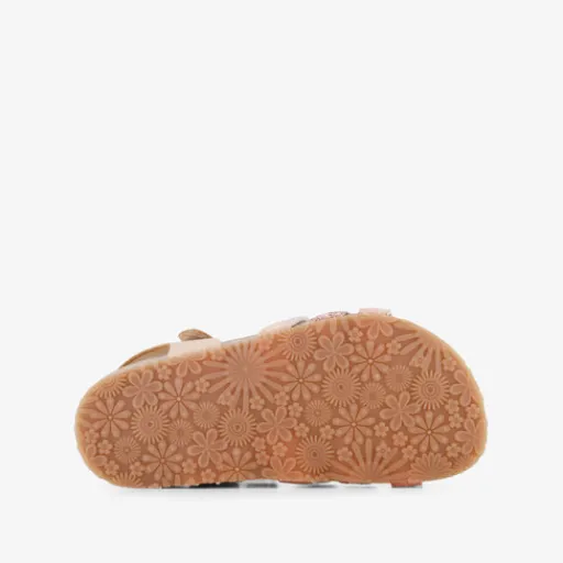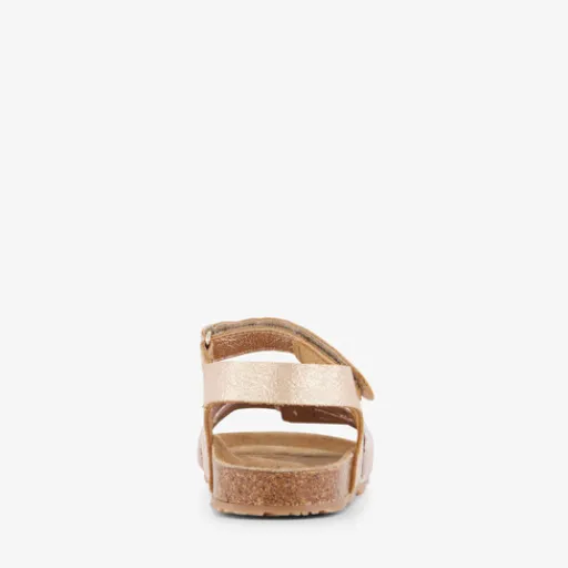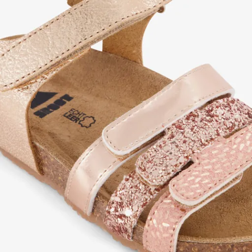 Champagne kleurige bio sandalen voor meisjes. Gemaakt van leer, een binnenwerk van leer en een rubberen zool. De sandalen zijn verstelbaar middels de klittenbandsluitingen op de wreef en teenband voor een optimale pasvorm. Het comfortabele voetbed is gemaakt van zacht leer. Deze is niet uitneembaar. Voorzien van glitters en en roze details op het bovenwerk en een kurkzool.