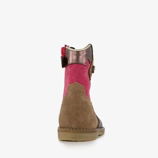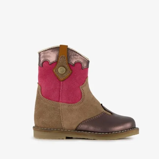 Bruin met roze western enkellaarsjes van Groot. Gemaakt van suede, een binnenwerk van leer en een rubberen zool. De enkellaarsjes hebben een ritssluiting met klittenbandje aan de binnenzijde en een uitneembaar voetbed van leer. Voorzien van roze details en metallic accenten op het bovenwerk