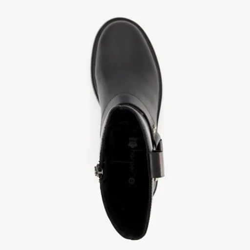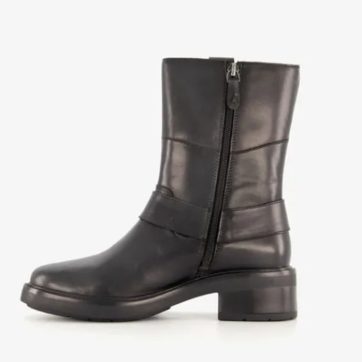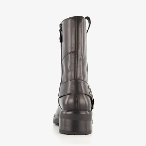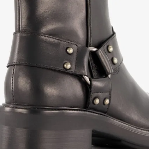 Zwarte biker boots voor dames van Harper. Gemaakt van leer, een binnenwerk van leer en een rubberen zool. De boots hebben een ritssluiting aan de binnenzijde en gesp met studs rondom de schoen. Het vaste voetbed is gemaakt van leer. De stoere biker boots hebben een schachthoogte van 19 cm en een lage hak van 2,5 cm.