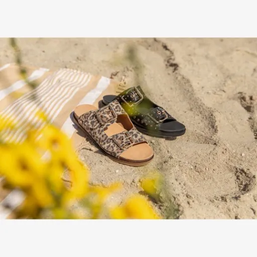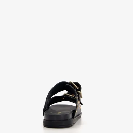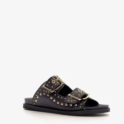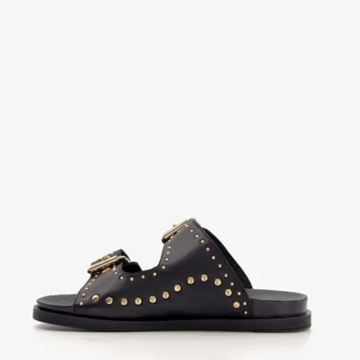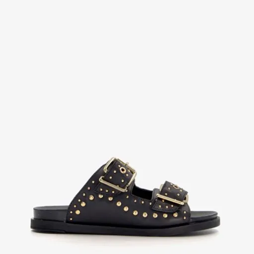 Zwarte slippers met goudkleurige studs voor dames uit de Harper collectie. Gemaakt van leer met stevige buitenzool. Voorzien van twee brede banden met gespsluiting over de wreef. Het comfortabele voetbed is gemaakt van leer en is niet uitneembaar.