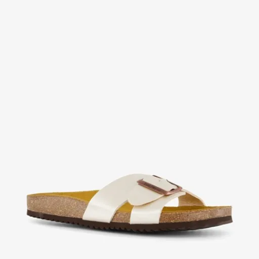 Champagne kleurige bio slippers voor dames van Hush Puppies. Gemaakt van imitatieleer en voorzien van een stevige zool van rubber. De slippers hebben een wreefband met gespsluiting en een comfortabel voetbed van zacht, ademend leer.