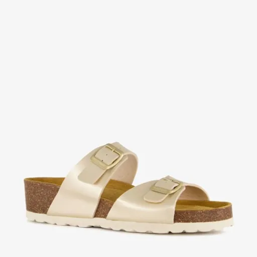 Parelmoer slippers voor dames van Hush Puppies. Gemaakt van imitatieleer, een binnenwerk van textiel en een rubberen zool. De slippers hebben twee wreefbanden met gespen voor een optimale pasvorm. Het zachte voetbed is gemaakt van leer en bevat memory foam voor extra comfort. De bio slippers hebben een sleehak van circa 4,5 cm.