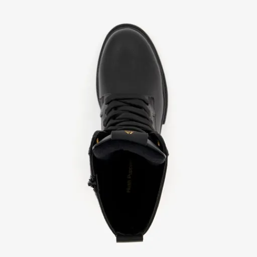 Zwarte veterboots van Hush Puppies. Gemaakt van imitatieleer, een binnenwerk van textiel en een rubberen zool. De boots hebben een vetersluiting en rits aan de binnenzijde. Het voetbed is gemaakt van textiel. Deze is uitneembaar zodat je je eigen (steun)zooltjes in de schoenen kunt dragen. De veterboots hebben een schachthoogte van 17 cm en een lage hak van circa 2 cm. Voorzien van goudkleurige merkopdrukken op de tong en bij de hak.