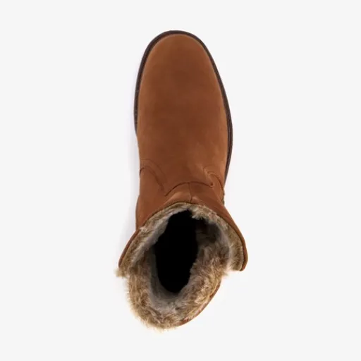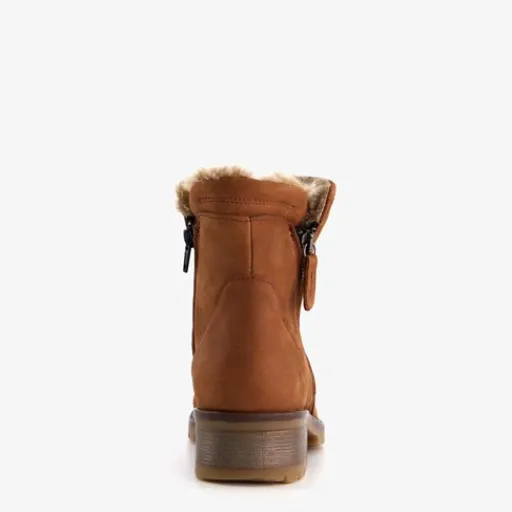 Cognac bruine enkellaarsjes voor dames van Hush Puppies. Gemaakt van leer, een binnenwerk van textiel en een rubberen zool. De laarsjes hebben een ritssluiting aan de binnenzijde en een uitneembaar voetbed van textiel. Voorzien van een warme voering van imitatiebont. De enkellaarzen hebben een schachthoogte van 13 cm en een lage hak van circa 3 cm.