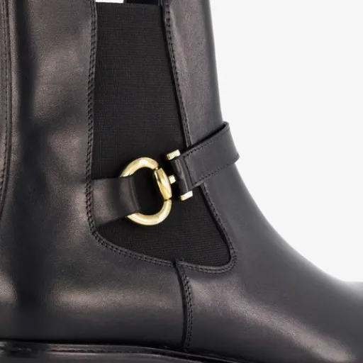 Lage Chelsea boots met goudkleurige gesp van Hush Puppies. Gemaakt van leer, een binnenwerk van textiel en een rubberen zool. De boots hebben een elastische inzet en aantreklusje op de hiel. Het vast voetbed is gemaakt van textiel. Voorzien van een schachthoogte van 15 cm en een lage hak van 2 cm.