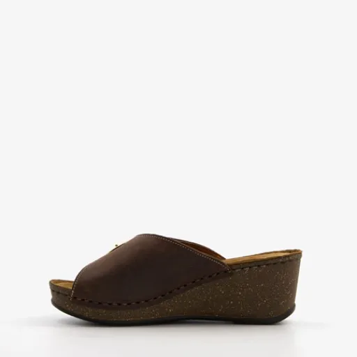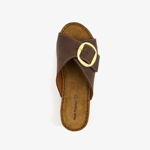 Bruine dames slippers met sleehak van Hush Puppies. Gemaakt van leer met een stevige zool van rubber. Voorzien van een brede band over de wreef met een goudkleurig gespsluiting. Het comfortabele voetbed van textiel is niet uitneembaar. De sleehak is circa 5 cm.