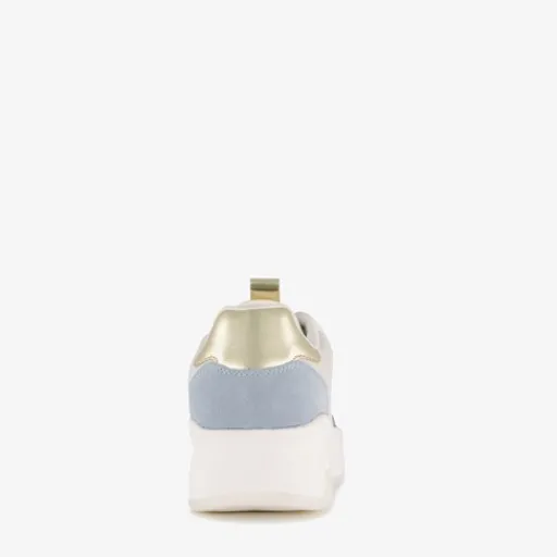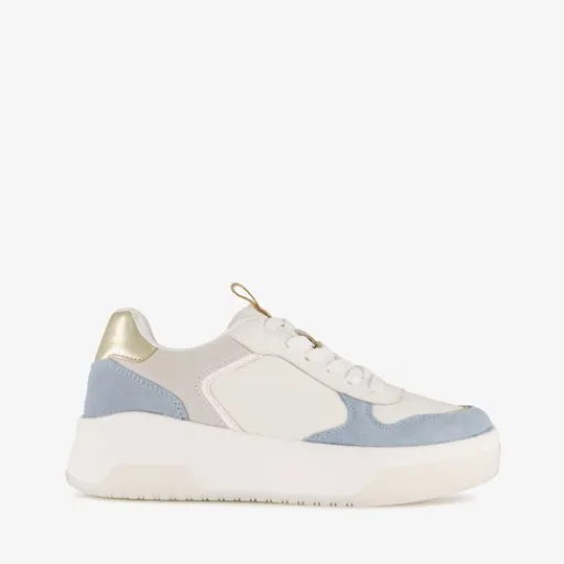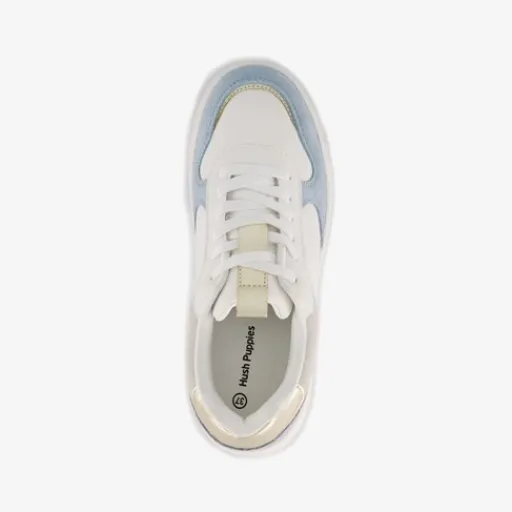 Witte dames sneaker van Hush Puppies met pastelblauwe accenten. Het buitenwerk is gemaakt van suède en leer, het binnenwerk van textiel en de stevige plateauzool met profiel is van rubber. Voorzien van een vetersluiting, aantreklusjes tong en een uitneembare binnenzool. De sneakers hebben goudkleurige details en beige accenten.