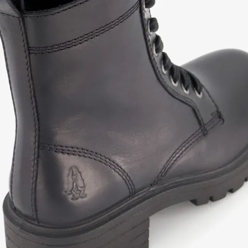 Zwarte veterboots voor dames uit de Hush Puppies collectie. Het buiten- en binnenwerk zijn gemaakt van leer en de stevige buitenzool met profiel is van rubber. De boots zijn voorzien van een vetersluiting, een ritssluiting aan de binnenzijde en een aantreklusje aan de achterzijde voor een gemakkelijke instap. Ze hebben een stoere, grove buitenzool en een vaste binnenzool van synthetisch materiaal. De schachthoogte is 15 cm.