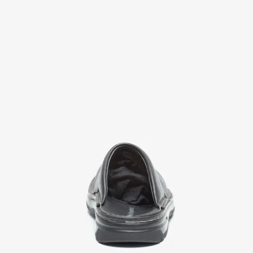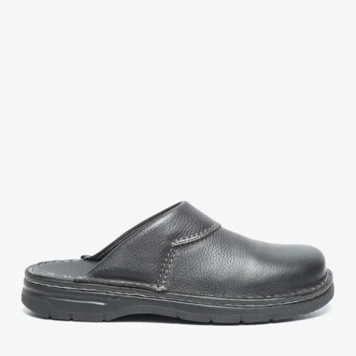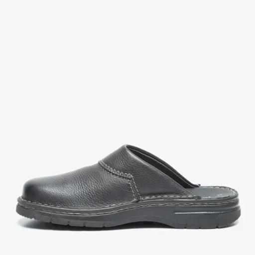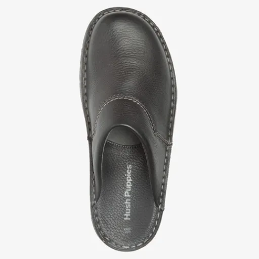 Zwarte muilen van Hush Puppies. Gemaakt van leer, een binnenwerk van leer en een stevige profielzool. De comfortabele schoenen hebben een makkelijke instap en een laag hakje