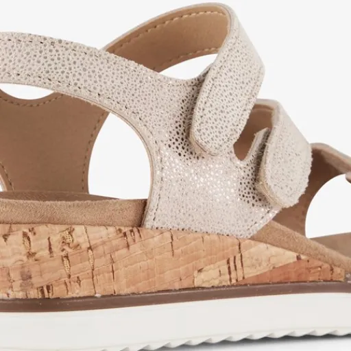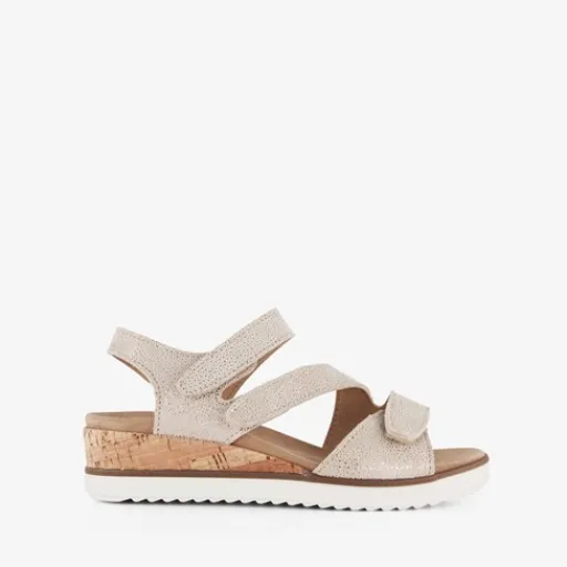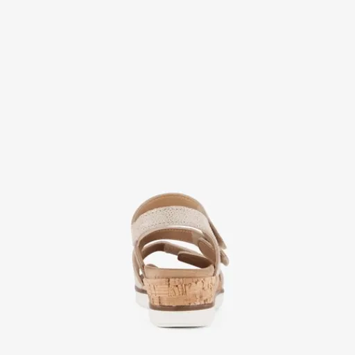 Beige sandalen voor dames van Hush Puppies. Gemaakt van leer, een binnenwerk van imitatieleer en een rubberen zool. De sandalen hebben drie klittenbandsluiting op de tenen en wreef voor een makkelijke instap en optimale pasvorm. Het comfortabele voetbed is gemaakt van imitatieleer. Deze is uitneembaar. Voorzien van een subtiel. goudkleurig dessin op het bovenwerk en een lage sleehak van circa 4 cm.