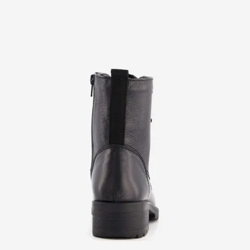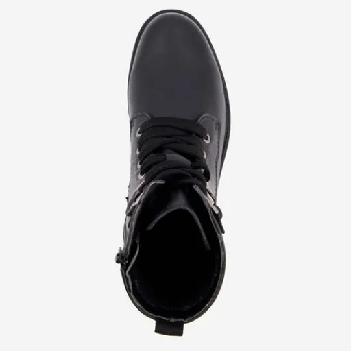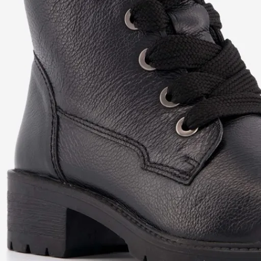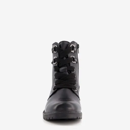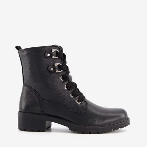 Zwarte veterboots voor dames van Hush Puppies met brede veters. Gemaakt van leer met een binnenwerk van textiel en een stevige profielzool van rubber. Voorzien van een veter- en een ritssluiting en hiellusjes voor een makkelijke instap. Het comfortabele voetbed van textiel. Deze is uitneembaar, zodat je eventueel jouw eigen zolen in de schoenen kan dragen. Schachthoogte is 15 cm en hakhoogte circa 2,5 cm. Deze boots zijn verkrijgbaar tot en met maat 44.