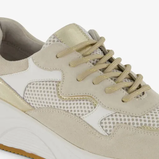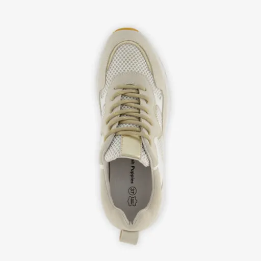 Beige sneakers voor dames van Hush Puppies. Gemaakt van suede, een binnenwerk van leer en een rubberen zool. De sneakers hebben een vetersluiting en hiellusje. Het voetbed is gemaakt van leer en is uitneembaar. Voorzien van witte details en metallic gouden accenten.
