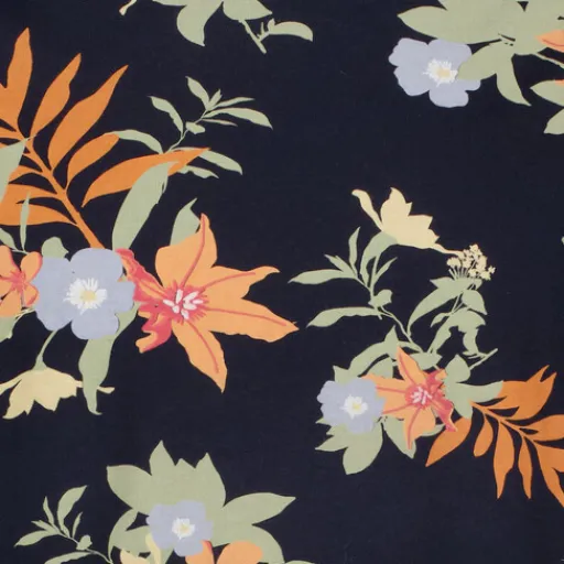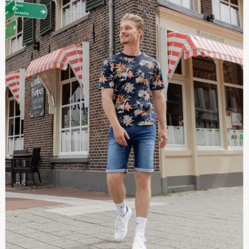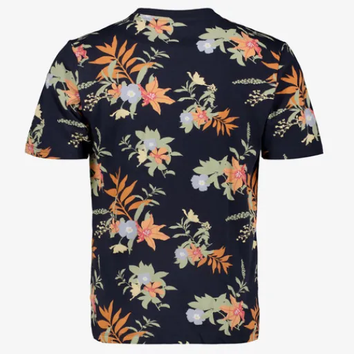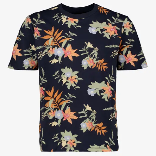 Donkerblauw heren T-shirt met print van JJ REBEL. Voorzien van een ronde hals, korte mouwen en een botanische print in de kleuren oranje, blauw en groen. Het shirt is gemaakt van 100% katoen.