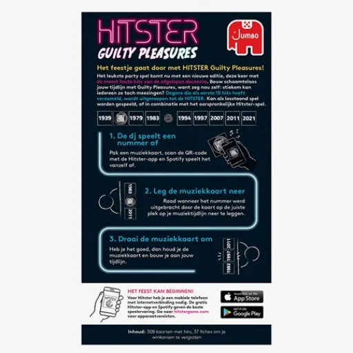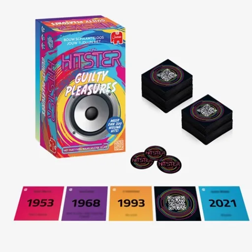 Met deze nieuwe editie van Hitster komen al jouw favoriete guilty pleasure hits voorbij. Scan de kaart, raad het foute nummer, de artiest en leg het kaartje op de tijdlijn. Degene die als eerste 10 nummers in de juiste chronologische volgorde weet te plaatsen wint! Dus nodig je vrienden uit voor een onvergetelijke avond en ontdek wie de echte guilty pleasures koning of koningin is! Het spel is geschikt voor volwassenen vanaf 16 jaar en voor 2 tot 10 spelers.