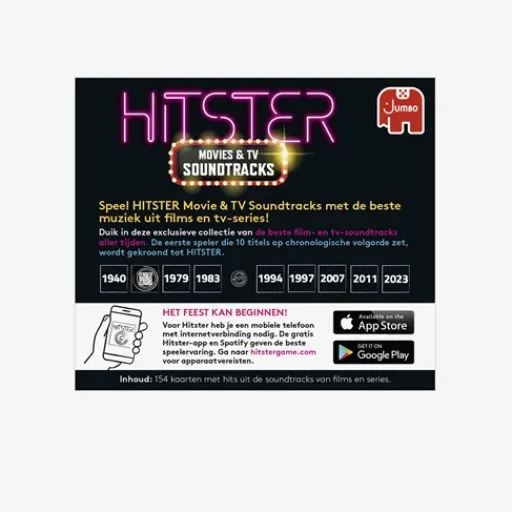Deze unieke versie van Hitster neemt je mee op een nostalgische reis door de grootste film- en seriemuziek van de afgelopen decennia. Herken jij de bekendste nummers en kun je ze in de juiste chronologische volgorde plaatsen? Daag jezelf en anderen uit in deze spannende strijd om de titel van ultieme HITSTER! Herbeleef de hoogtepunten van film- en tv-historie terwijl je geniet van een beetje competitie en heel veel plezier. Geschikt voor 2 tot 10 spelers vanaf 16 jaar, met competitieve, coöperatieve én solo-opties.