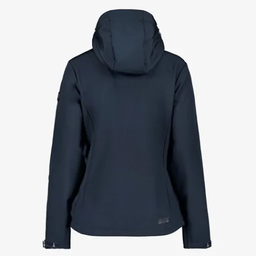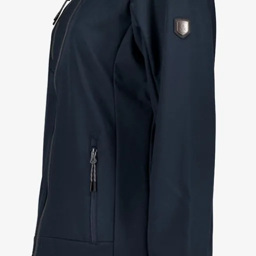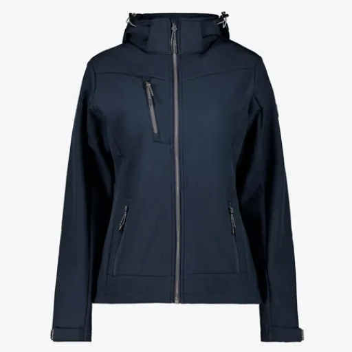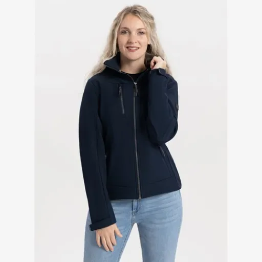 Blauwe softshell jas voor dames van Kjelvik. Voorzien van een ritssluiting met kinbeschermer, een afneembaar capuchon met aantrekkoordjes en drie zakken met ritsen aan de voorzijde. Deze damesjas is waterafstotend, winddicht en vervaardigd van ademend materiaal. Gemaakt van 94% polyester en 6% polyester.