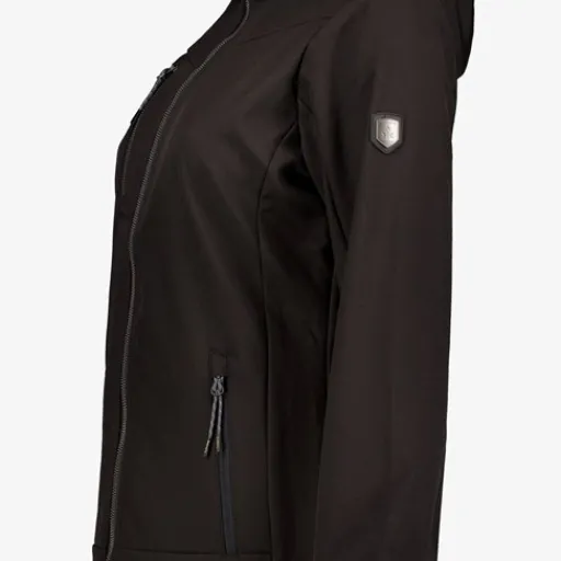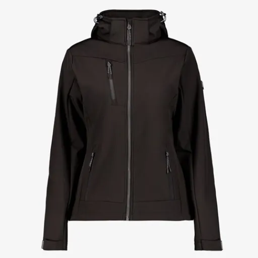 Zwarte softshell jas voor dames van Kjelvik. Voorzien van een ritssluiting met kinbeschermer, een afneembaar capuchon met aantrekkoordjes en drie zakken met ritsen aan de voorzijde. Deze damesjas is waterafstotend, winddicht en vervaardigd van ademend materiaal. Gemaakt van 94% polyester en 6% polyester.