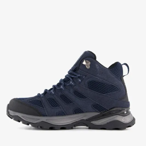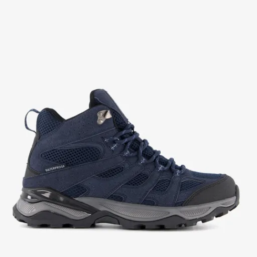 Hoge, blauwe categorie A/B wandelschoenen voor heren van Kjelvik. Het buitenwerk is gemaakt van mesh en textiel, het binnenwerk is van textiel en de stevige zool met profiel is van rubber. Voorzien van een vetersluiting, hiellusjes en een uitneembare binnenzool van textiel. De wandelschoenen zijn helemaal gevoerd en waterafstotend. Categorie A/B wandelschoenen zijn middelhoog en bieden voldoende steun en stabiliteit voor onverharde of ongelijke ondergronden. Ze zijn geschikt als allround wandel- en bergschoenen. De zolen van categorie A/B wandelschoenen zijn nog voldoende soepel.