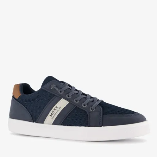 Blauwe heren sneakers van Mexx. Het buitenwerk is gemaakt van textiel en imitatieleer, het binnenwerk van textiel en stevige zool is van rubber. Voorzien van een vetersluiting en een comfortabele binnenzool van textiel. Deze is niet uitneembaar. De sneakers hebben een witte buitenzool, merkopdrukken aan de zijkanten en een bruine detail op de hak.