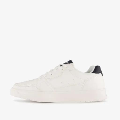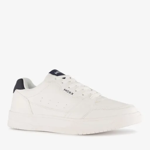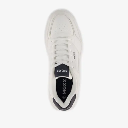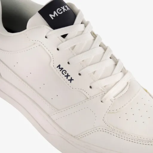 Witte sneakers voor heren van Mexx. Gemaakt van imitatieleer, een binnenwerk van textiel en een rubberen zool. De sneakers hebben een vetersluiting en comfortabel voetbed van textiel. Deze is uitneembaar. Voorzien van blauwe accenten en merkopdrukken op de tong en hiel.
