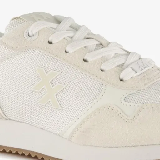 Witte dames sneakers van XX By Mess. Het buitenwerk is gemaakt van textiel en imitatieleer, het binnenwerk van textiel en de stevige zool met profiel is van rubber. Voorzien van een vetersluiting en een comfortabele, uitneembare binnenzool van textiel. De sneakers hebben merkopdrukken en een bruine buitenzool.