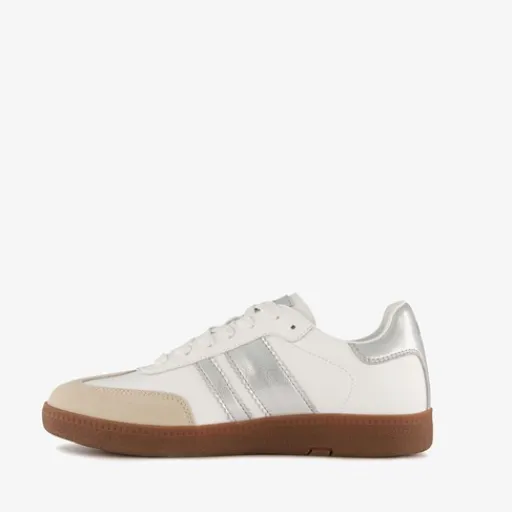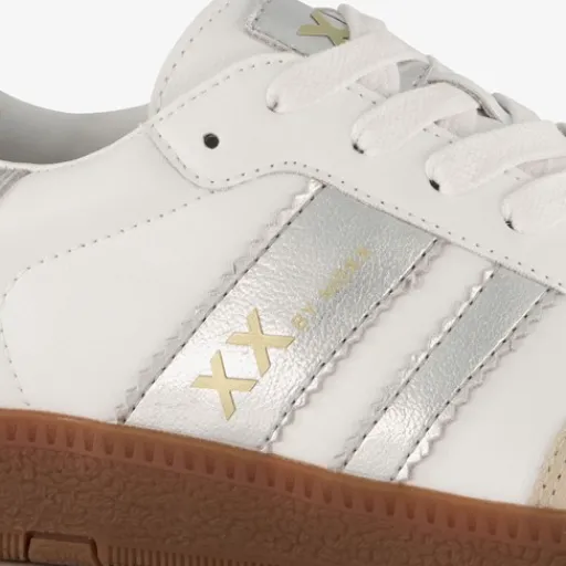 Lage, witte XX By Mexx sneakers voor dames. Gemaakt van imitatieleer, een binnenwerk van textiel en een rubberen zool. De sneakers hebbn een vetersluiting en comfortabel voetbed van imitatieleer. Deze is uitneembaar. Voorzien van zilverkleurige metallic details op het bovenwerk.