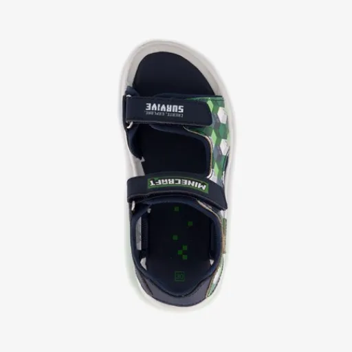 Blauwe Minecraft sandalen met lichtjes voor jongens. Gemaakt van imitatieleer met stevige profielzool van rubber. Voorzien van een klittenbandsluiting bij de enkel en om de tenen. De sandalen hebben Minecraft opdrukken op het bovenwerk en lichtjes in de zolen die aangaan wanneer er op de sandalen gelopen wordt. De lichtjes zijn niet oplaadbaar.