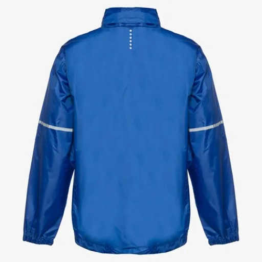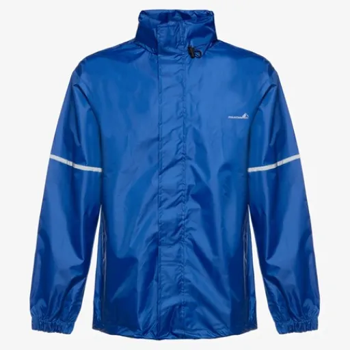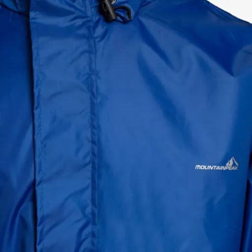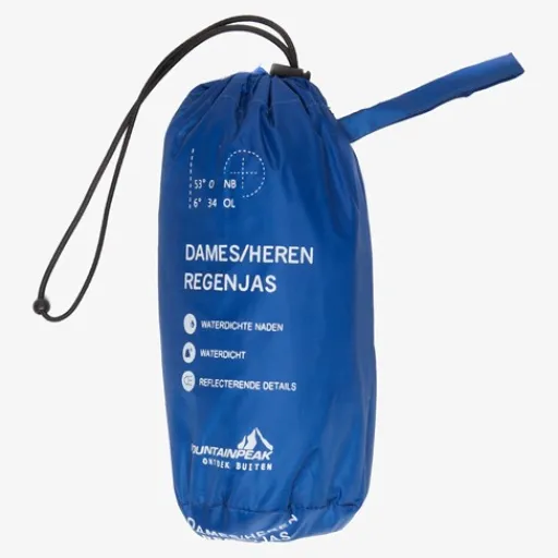 Blauwe regenjas voor heren en dames van Mountain Peak. Voorzien van een ritssluiting met overlappende klittenbandsluitingen zodat wind en regen tegen gehouden worden. De regenjas heeft elastische boorden en is aan de onderzijde aan te snoeren. Voorzien van een oprolbare capuchon en een waterdichtheid tot 2000mm. De winddichte regenjas heeft een handig opbergzakje en op de armen zijn reflecterende accenten aangebracht zodat je goed opvalt in het verkeer. Gemaakt van polyester.