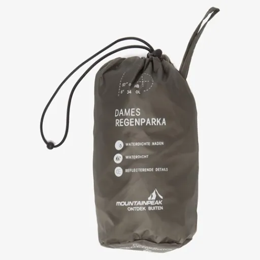 Groene Mountain Peak regenparka voor dames. Voorzien van een ritssluiting met overlappende klittenbandsluitingen zodat wind en regen tegen gehouden worden. De regenjas heeft elastische boorden en heeft een split aan de achterzijde. Voorzien van een capuchon en een waterdichtheid tot 10.000 MM. De winddichte regenjas heeft een handig opbergzakje en op de armen zijn reflecterende accenten aangebracht zodat je goed opvalt in het verkeer. Gemaakt van polyester.