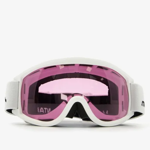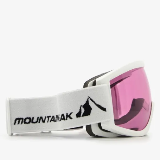 Mountain Peak dames skibril. Deze witte skibril heeft een roze gekleurde lens. Voorzien van een stevige, elastische bevestigingsband met veel stretch. Dit zorgt voor veel draagcomfort. De lens is voorzien van UV 400 bescherming en een anti-fog coating. De bril heeft dubbel layer foam rondom de lens.