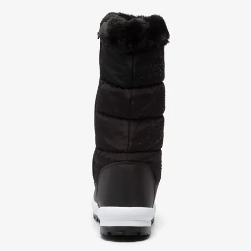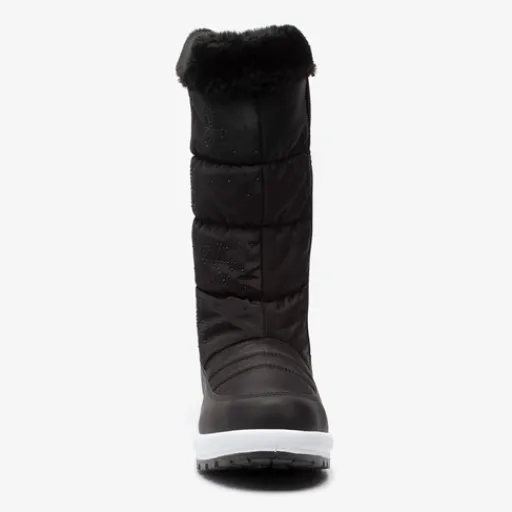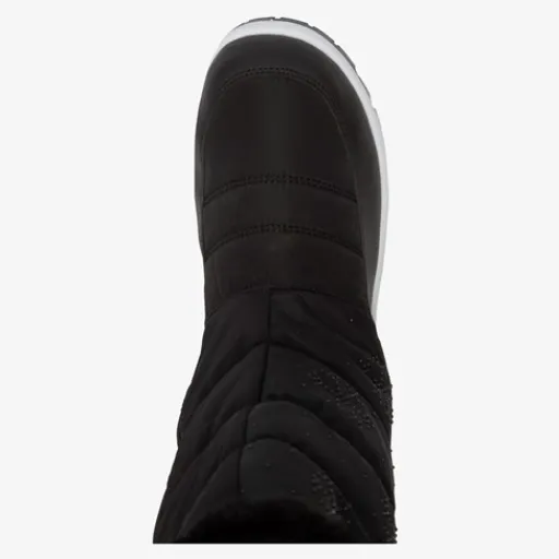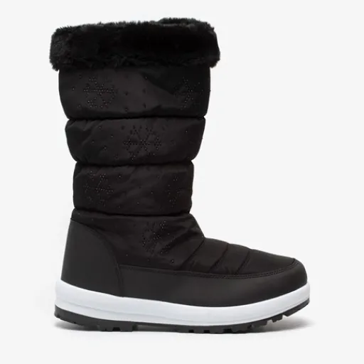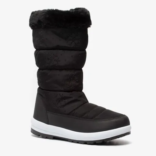 Zwarte dames snowboots uit de Scapino collectie. Gemaakt van synthetisch leer en nylon, een binnenwerk van textiel en een stevige profielzool van rubber. De snowboots hebben een ritssluiting aan de binnenzijde en voor een aansluitende pasvorm. Op deze manier blijven kou en sneeuw buiten en blijven de voeten lekker warm. De snowboots hebben een zachte binnenvoering van imitatiebont en een vast voetbed. Het bovenwerk is verfraaid met subtiele ijskristalletjes. De dikke, rubberen buitenzool biedt goede grip tijdens het lopen, ook op gladde ondergronden. Let op: deze snowboots vallen klein uit.