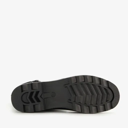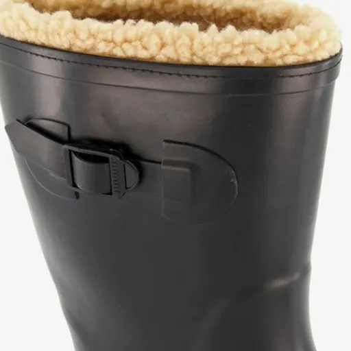 Zwarte regenlaarzen voor heren van Mountain Peak. Gemaakt van rubber met een stevige profielzool van rubber. Deze waterdichte laarzen hebben een decoratieve gesp aan de buitenzijde en zijn gevoerd met imitatiebont.