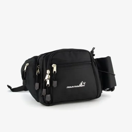 Zwarte heuptas van Mountain Peak. Voorzien van meerdere vakjes met ritssluiting, een verstelbare heupband, reflecterende strepen aan de zijkanten en een vakje aan de zijkant waar jij je fles in kan doen. Gemaakt van polyester. Afmetingen: 23 x 18 x 8 cm. Inhoud is 3 liter.