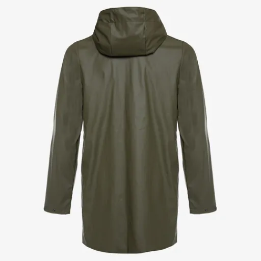 Lange, groene Mountain Peak regenjas voor heren. Voorzien van een waterdichte rits met overlappende drukknopen en kinbeschermer, een hoge kraag met vaste capuchon en aantrekkoordjes en twee klepzakken met drukknopen. De regenparka heeft een binnenzakje voor je mobiel en een extra zachte voering. De stof heeft een waterkolom van 1,500 MM. De winddichte regenparka is gemaakt van 100% polyester.