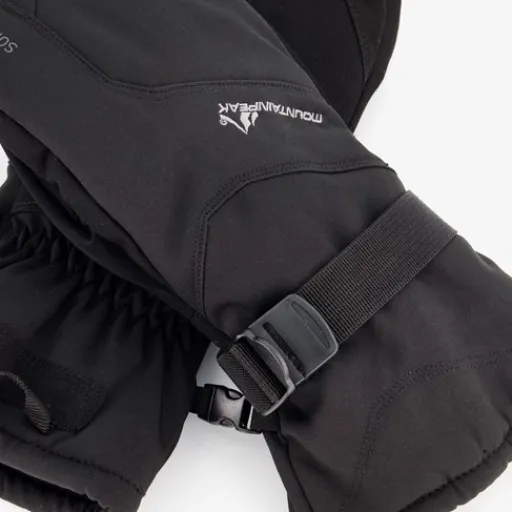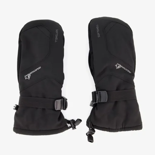 Zwarte softshell skiwanten voor dames en heren van Mountain Peak. Voorzien van aantrekkoordjes bij de polsen om te voorkomen dat er sneeuw binnendringt en gespen voor een aansluitende pasvorm. De handschoenen zijn winddicht, waterafstotend en hebben een zachte, warme binnenvoering. Gemaakt van 95% polyester en 5% spandex.