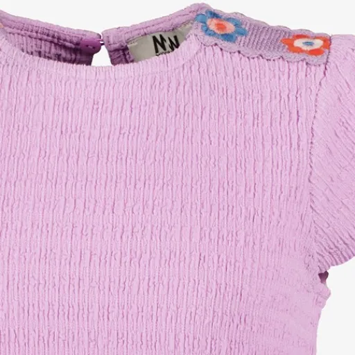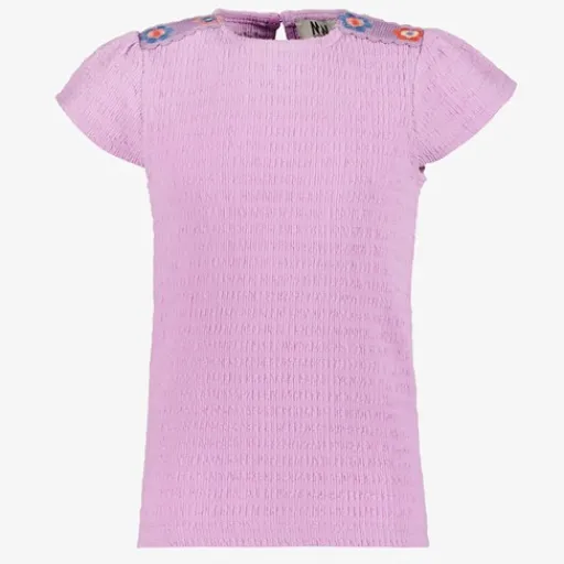 Lila T-shirt voor meisjes. Voorzien van korte mouwen, een ronde hals en knoopsluiting in de nek. Het shirt heeft borduursels op de schouders. Gemaakt van 98% polyester en 2% elastaan.