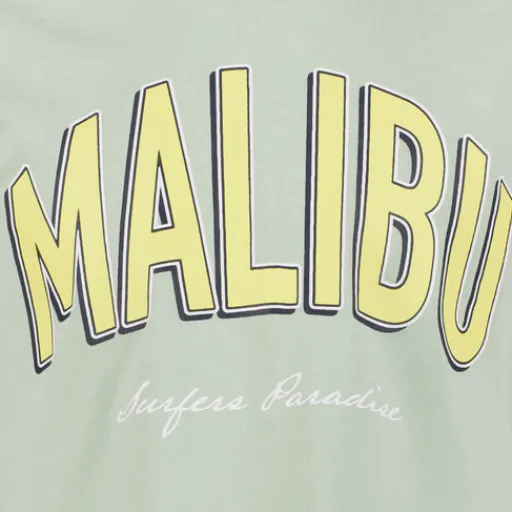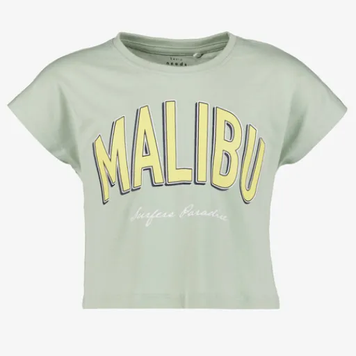 Groen cropped T-shirt voor meisjes van Name it. Voorzien van een ronde hals, korte mouwen en een gele tekstopdruk aan de voorzijde. Gemaakt van 100% katoen.