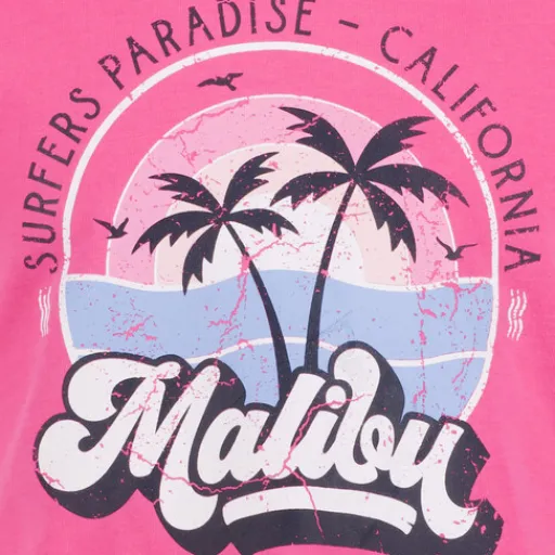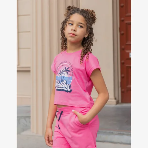 Roze, cropped T-shirt voor meisjes uit de Name it collectie. Voorzien van een ronde hals, korte mouwen en een vrolijke opdruk aan de voorzijde. Gemaakt van 100% katoen.