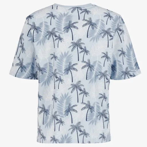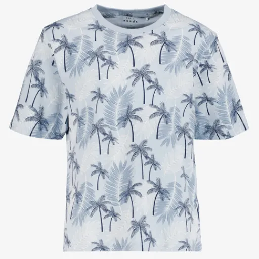 Blauw T-shirt voor jongens van Name It. Voorzien van korte mouwen, een ronde hals en een all over palmbomen print. Gemaakt van 100% katoen.