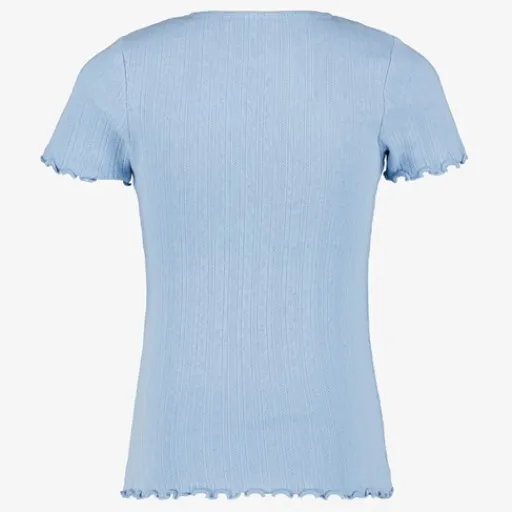 Lichtblauw T-shirt voor meisjes van Name It. Voorzien van korte mouwen en een hoge, ronde hals. Het shirt heeft structuur in de stof en ruches bij de boorden. Gemaakt van 100% katoen.