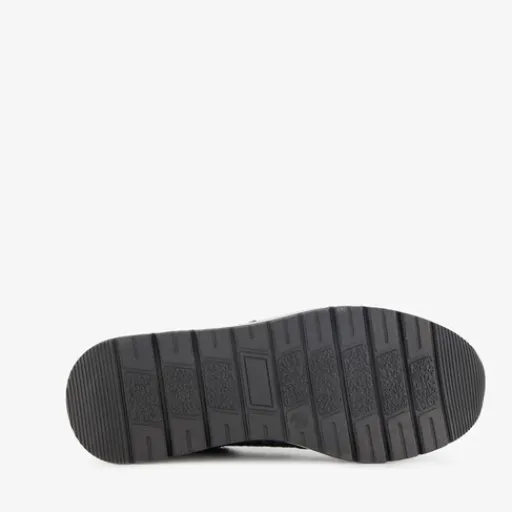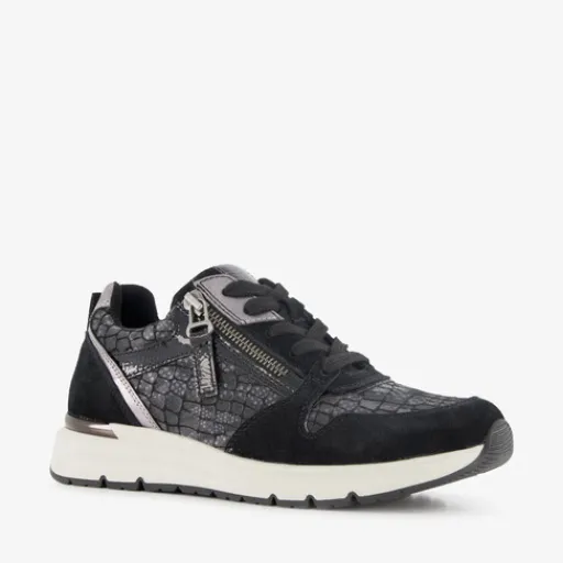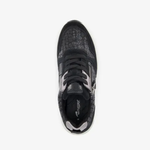 Zwarte sneakers met slangenprint details voor dames van Natuform. Het buiten- en binnenwerk is gemaakt van imitatieleer en de stevige zool met profiel is van rubber. Voorzien van een vetersluiting, een ritsje aan de buitenzijde en hiellusjes voor een makkelijke instap. Het voetbed van synthetisch materiaal is uitneembaar zodat je je eigen zolen in de schoenen kan dragen, De sneakers hebben goudkleurige detail op de hak en een contrasterende witte buitenzool.