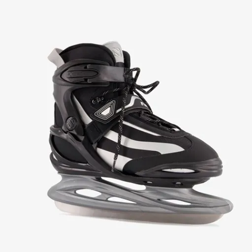 Zwarte semi-softboot ijshockeyschaatsen van Nijdam. Voorzien van een binnenschoen met mesh voering en EVA foam. Het schokabsorberende buitenwerk is gemaakt van stevige kunststof. De schaatsen hebben veters, een snelsluiting met PU lederen powerstrap, roestvaststalen ijshockeyschaatsijzers en high-impact PP schaatshouder. De schaatsijzers worden voorgeslapen geleverd.