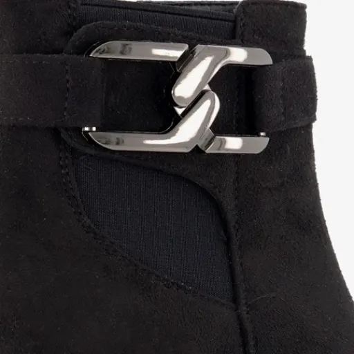 Zwarte haklaarsjes van Nova. Gemaakt van imitatiesuede, een binnenwerk van textiel en een rubberen zool. De enkellaarsjes hebben een rissluiting aan de binnenzijde en een gesp aan de buitenzijde. Het vaste voetbed is gemaakt van imitatieleer. De laarsjes hebben een schachthoogte van 11 cm en een blokhak van 7 cm.