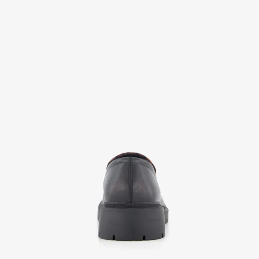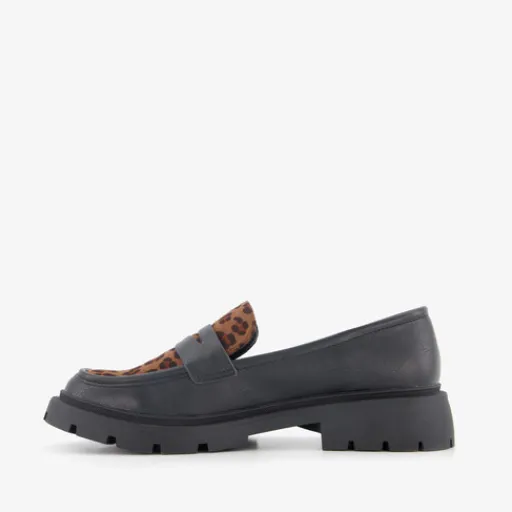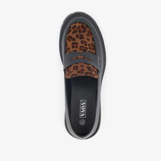 Zwarte dames loafers met panterprint details van Nova. Het buitenwerk is gemaakt van imitatieleer, het binnenwerk van textiel en de stevige zool met profiel is van rubber. De loafers hebben een lage hak en de binnenzool van synthetisch materiaal is niet uitneembaar.
