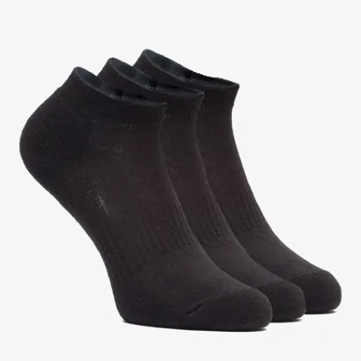 Drie paar zwarte sneakersokken uit de Osaga collectie. De sokken zijn laag van model en gemaakt van 77% katoen, 20% polyamide en 3% elastaan.