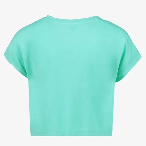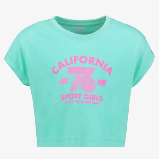 Kort, groen sport T-shirt voor meisjes. Voorzien van korte mouwen, een ronde hals en een roze opdruk. Het cropped sportshirt is gemaakt van 55% organic katoen en 45% viscose.