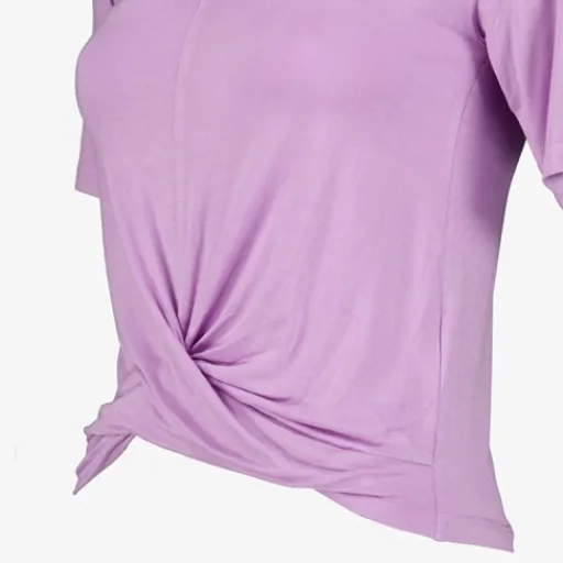 Paars cropped sport T-shirt voor dames van Osaga. Voorzien van een ronde hals, korte mouwen en een knoop aan de onderkant. Gemaakt van 94% viscose (tencel) en 6% elastaan.